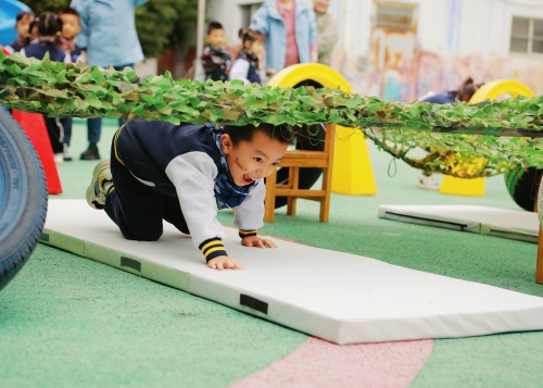 伴着激昂的国歌,中班“海陆空”方队迈着整齐步伐入场,嘹亮口号响彻操场!海军“水上运输”挑战中,宝贝踩竹梯稳稳运水瓶,家长保驾护航;陆军“陆地侦察”里,幼儿匍匐穿越迷彩网,家长携娃爬行闯关;空军“协力向前冲”时,亲子钻履带、夹木棍默契配合。在执行任务的游戏中,孩子们不仅锻炼了平衡、爬行与协作能力,更萌发了对军人的敬佩之情,集体荣誉感满满!亲子间的并肩作战,让情感在汗水与欢笑中愈发深厚,也让“共鉴成长”有了更热血的表达。