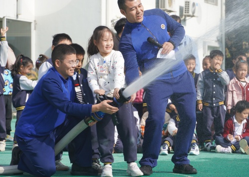 准备——喷!” 随着消防员叔叔一声令下,瞬间被一道强劲的水柱在阳光下划出美丽的弧线,引得孩子们阵阵欢呼。在确保安全的前提下,消防员叔叔还让部分孩子上前感受了一下水枪的威力,体验了一把“灭火英雄”的威风!