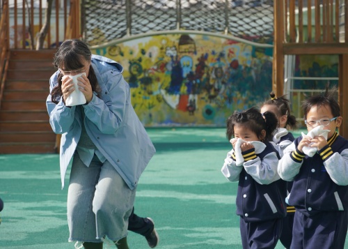 “呜——呜——” 随着一阵急促的警报声响起,消防逃生演练正式开始!在老师的引导下,迅速用湿毛巾捂住口鼻,弯腰低姿,沿着预定疏散路线,快速而有序地撤离到安全地带。演练结束后,吴琳园长对本次逃生演练进行了总结。她表扬了孩子们在演练中的沉着冷静和井然有序,并再次强调了火灾发生时“弯腰、捂鼻、速撤离”的黄金逃生法则。