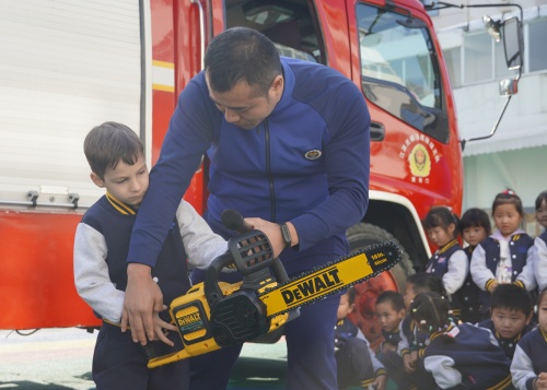 最让孩子们期待的环节——“蓝朋友”来啦!他们带来了许多平时只能在电视上看到的消防“神器”!“这个像大剪刀一样的是什么呀?”“叔叔,这个面罩戴上能看到东西吗?”面对孩子们好奇的目光,消防员叔叔耐心地介绍着。孩子们在消防员叔叔的帮助下,小心翼翼地触摸、试戴这些“神器”,过了一把“小小消防员”的瘾!
